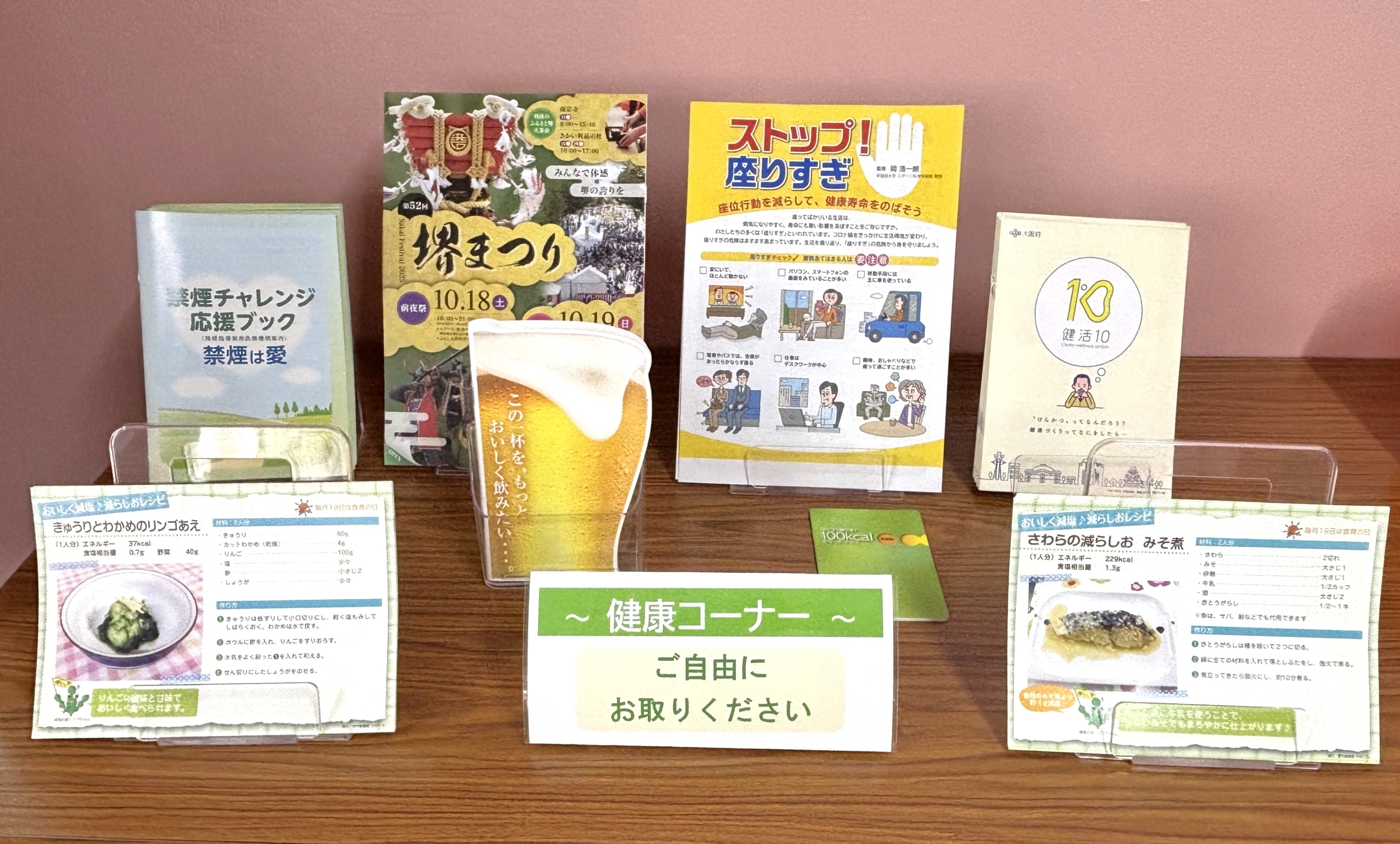 従業員の健康づくりを助ける、健康に関する情報が載ったパンフレットや冊子、健康レシピ他お知らせなど手に取って見れるコーナーを設置しました。