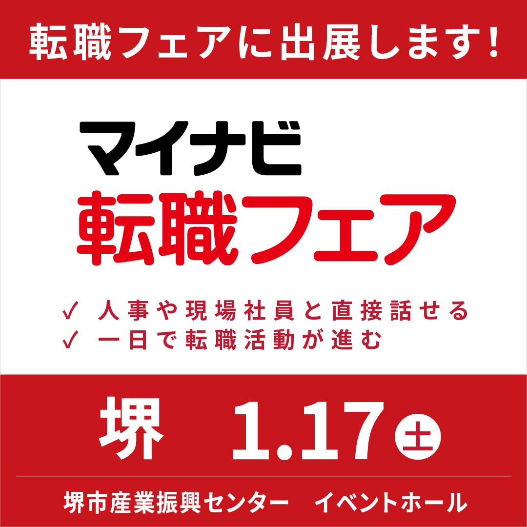 2026年1月17日(土)に堺市産業振興センター、イベントホールにて開催されるマイナビ転職フェアに出展いたします。